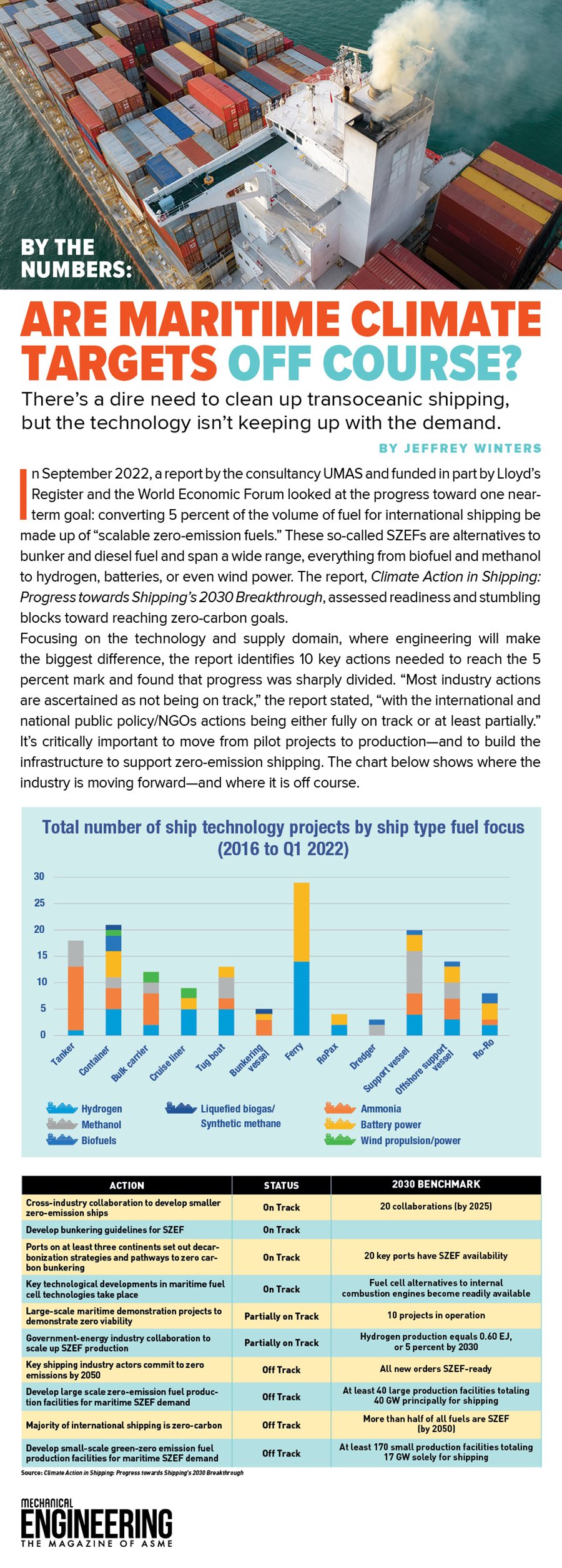 In September 2022, a report by the consultancy UMAS and funded in part by Lloyd’s Register and the World Economic Forum looked at the progress toward one near-term goal: converting 5 percent of the volume of fuel for international shipping be made up of “scalable zero-emission fuels.” These so-called SZEFs are alternatives to bunker and diesel fuel and span a wide range, everything from biofuel and methanol to hydrogen, batteries, or even wind power. The report, Climate Action in Shipping: Progress towards Shipping’s 2030 Breakthrough, assessed readiness and stumbling blocks toward reaching zero-carbon goals.