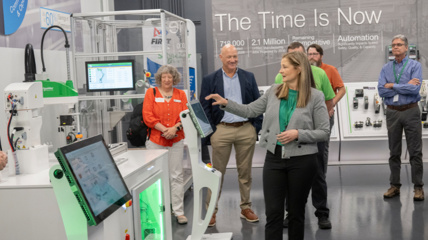 Christine Bush, director of the Robotic and Motion Center of Excellence in Raleigh, guides visitors through the factory floor.